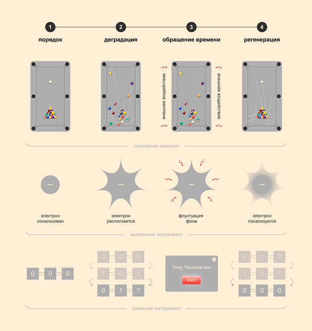 Початковий стан системи і три стадії експерименту з квантовим комп’ютером, що повторюють мисленнєвий експеримент з електроном, і аналогія механічної системи більярдних кульок. Під дією точного втручання система переходить у впорядкований стан, що трактується як «повернення в часі». Джерело: @tsarcyanide, пресс-служба МФТИ