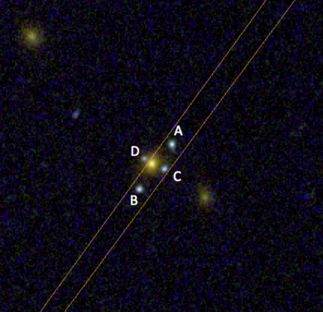 В новому знімку, отриманому телескопом «Габбл», віддалена галактика зобразилася одразу чотири рази, створивши фігуру, відому під назвою «хрест Ейнштейна». Щоби підтвердити, що це справді наслідок гравітаційного лінзування, а не окремі об’єкти, вчені застосували інший телескоп «Gran Telescopio Canarias» для спектроскопічних досліджень.