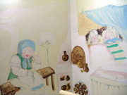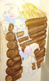 Художній розпис стін – робота тонка і цікава. Спочатку змішуються фарби, щоб отримати потрібний тон, додається максимальна кількість білого кольору – малюнки мають бути світлими. А потім, підібравши пензлики і дивлячись на картинку сюжету з казки, починається робота. Розмалювати у неділю встигли чимало – Дюймовочку і джмеля, півника, бабусю з прядкою, гномів, зайця, мудру сову і майже всіх персонажів з «Ріпки». А що не встигли – залишили на наступний раз.