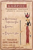 Студия "Кайрос" специализируется на изготовлении репродукций памятников древнего искусства: барельефов, бюстов, статуэток, мелкой пластики. В настоящее время в производстве находится около 200 моделей по основным направлениям: Древний Египет, Древняя Греция, Рим, Древний Восток, Мезоамерика, Европа, Славянство. Репродукции изготавливаются из высококачественного гипса и искусственного мрамора с последующей росписью или тонировкой, имитирующей светлый или темный камень, бронзу, и т.п. В этом мире быстротечно все: проходит время, меняется мода, одна эпоха уступает место другой. Но есть посреди этой быстротечности своего рода островки стабильности, несущие через века воплощенные в материале вечные человеческие ценности. Это произведения искусства, следы человеческого духа, отражение красоты и величия самого человека и окружающего его мира. Над ними не властно время; а они, в свою очередь, могут поведать многое о давно минувших временах.